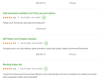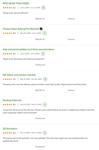 Savo turinio kūrimo paslaugas teikiau laisvai samdomų specialistų (angl. freelancer) platformose. Štai dalis klientų atsiliepimų iš Upwork svetainės.